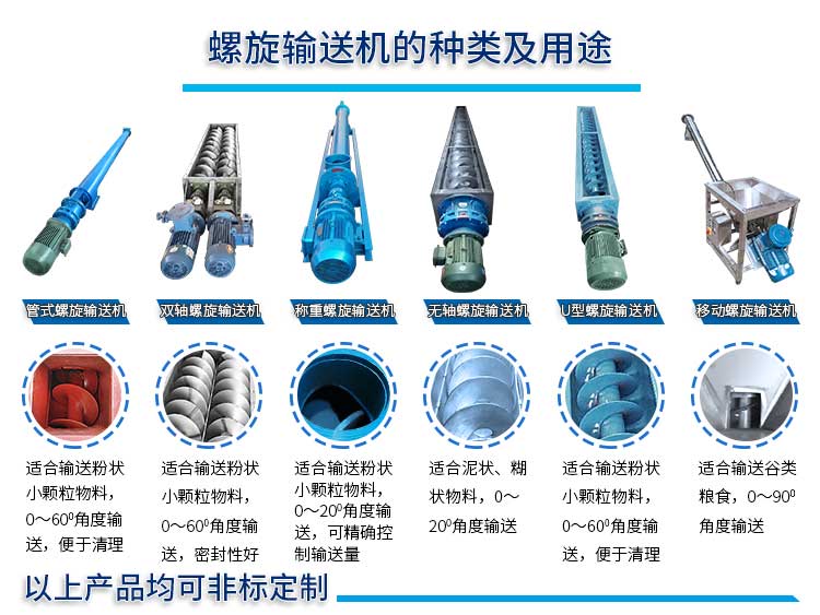 不銹鋼螺旋輸送機(jī)型式可分為LSY螺旋輸送機(jī)(管式),LS螺旋輸送機(jī)(U型),GX螺旋輸送機(jī)(U型),LC垂直螺旋輸送機(jī)及WLS無軸螺旋輸送機(jī),其結(jié)構(gòu)型式及設(shè)計(jì)參數(shù)可參考其他螺旋輸送機(jī)的介紹頁面。